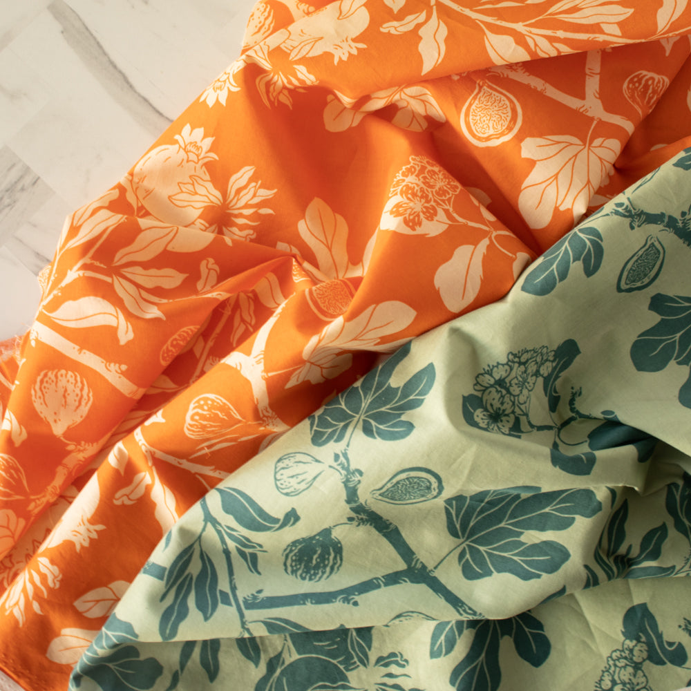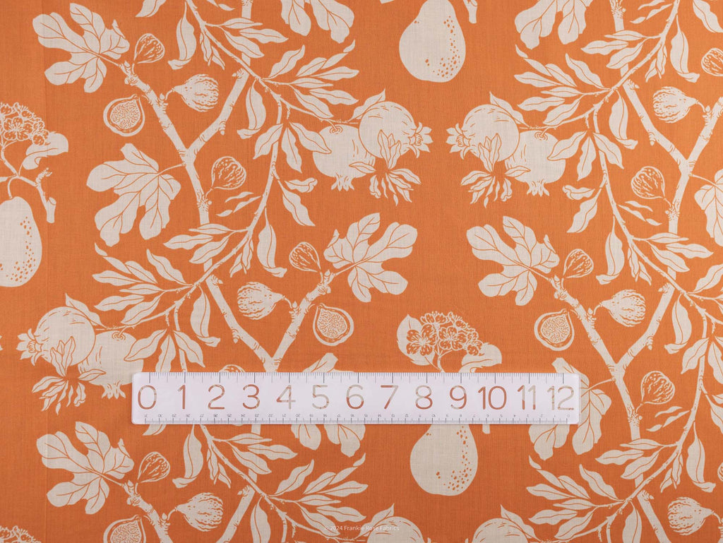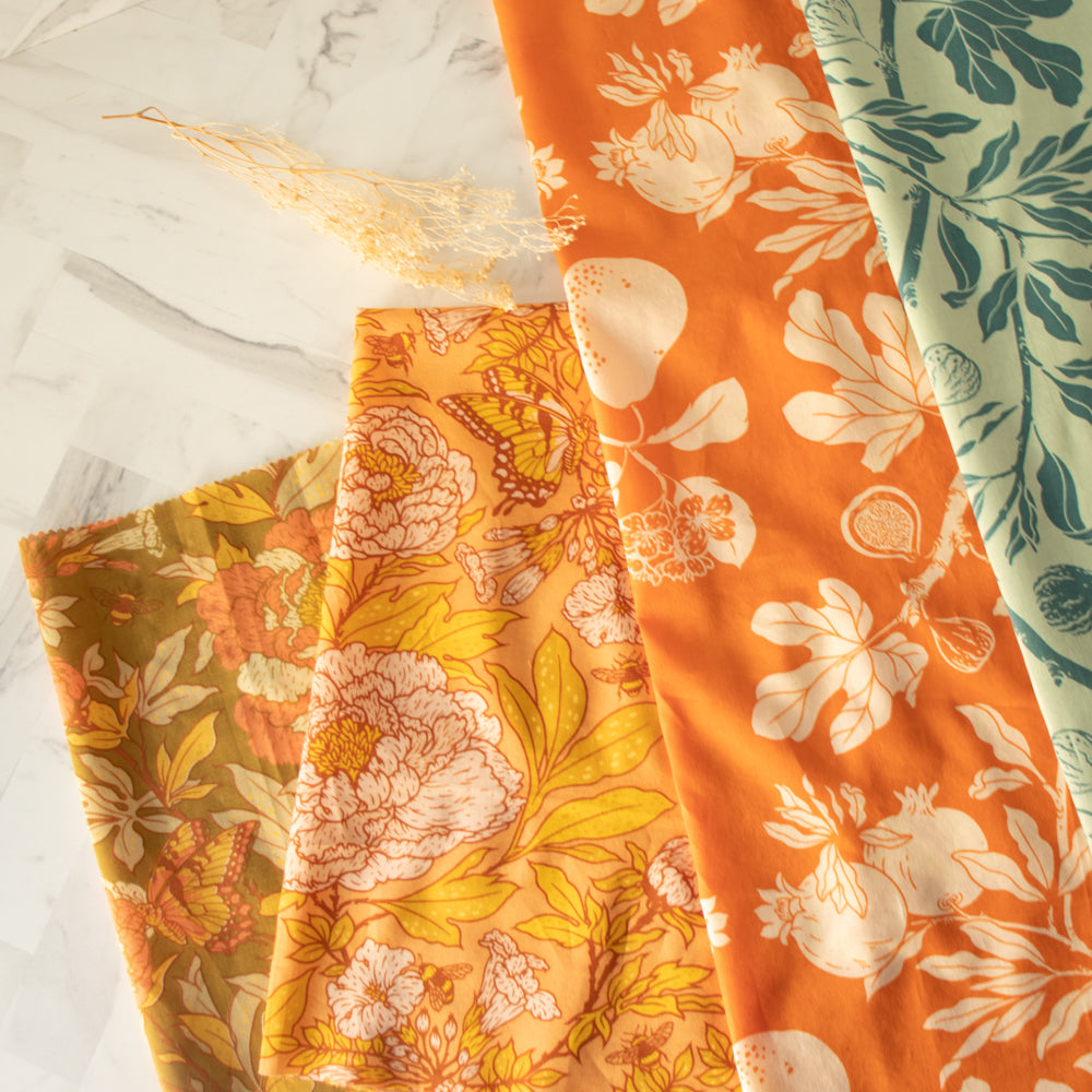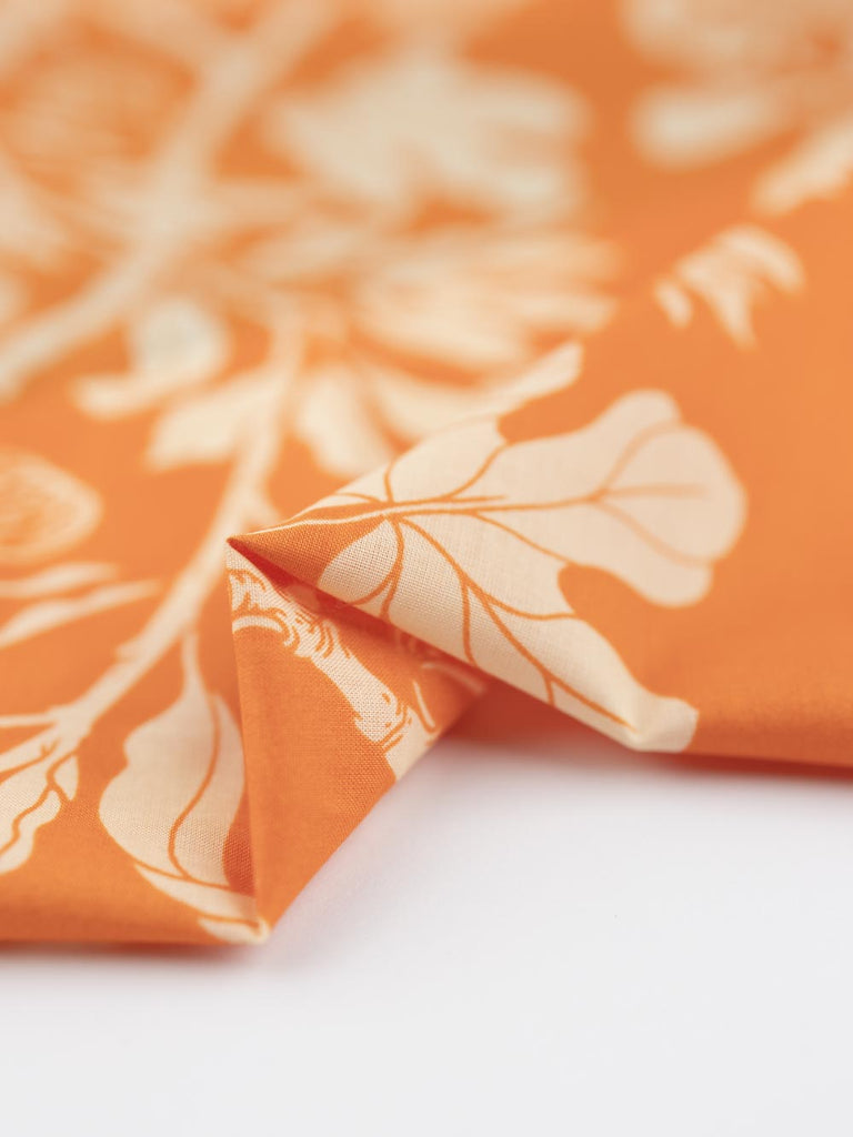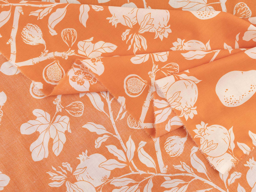 This lightweight, organic cotton lawn fabric, designed by Elizabeth Jean Younce of Mustard Beetle, is part of Birch Fabric's Bountiful collection. It's a bright melon orange with cream colored fig vines, pomegranates, and pears. Slightly translucent (but made less so by the print), this smooth fabric is perfect for billowy blouses and dresses, as well as fluttery curtains and home accessories.