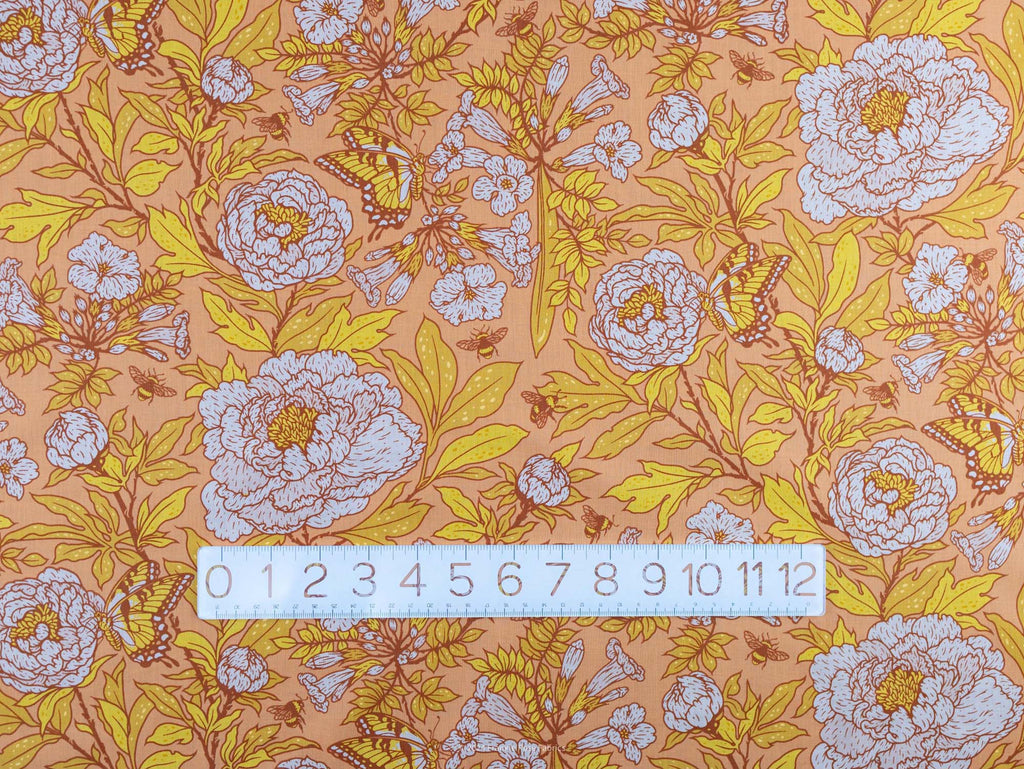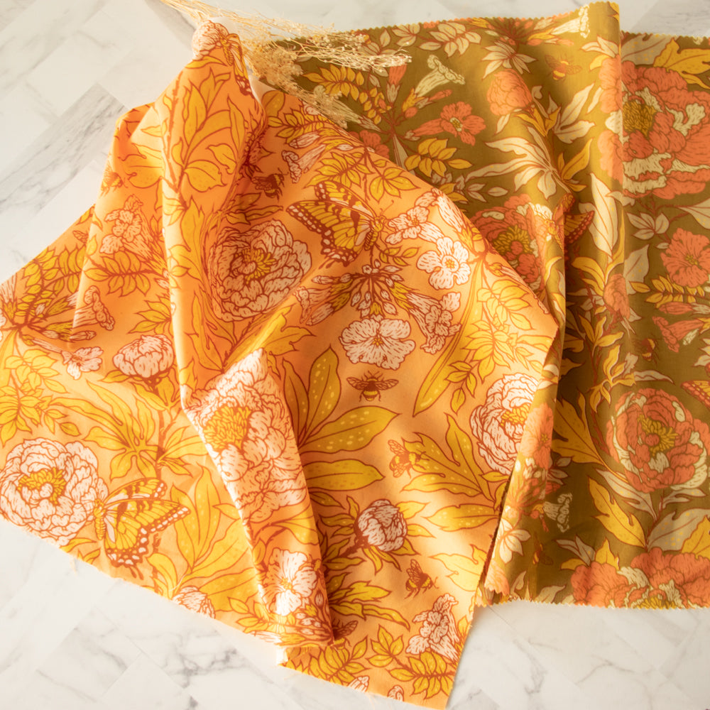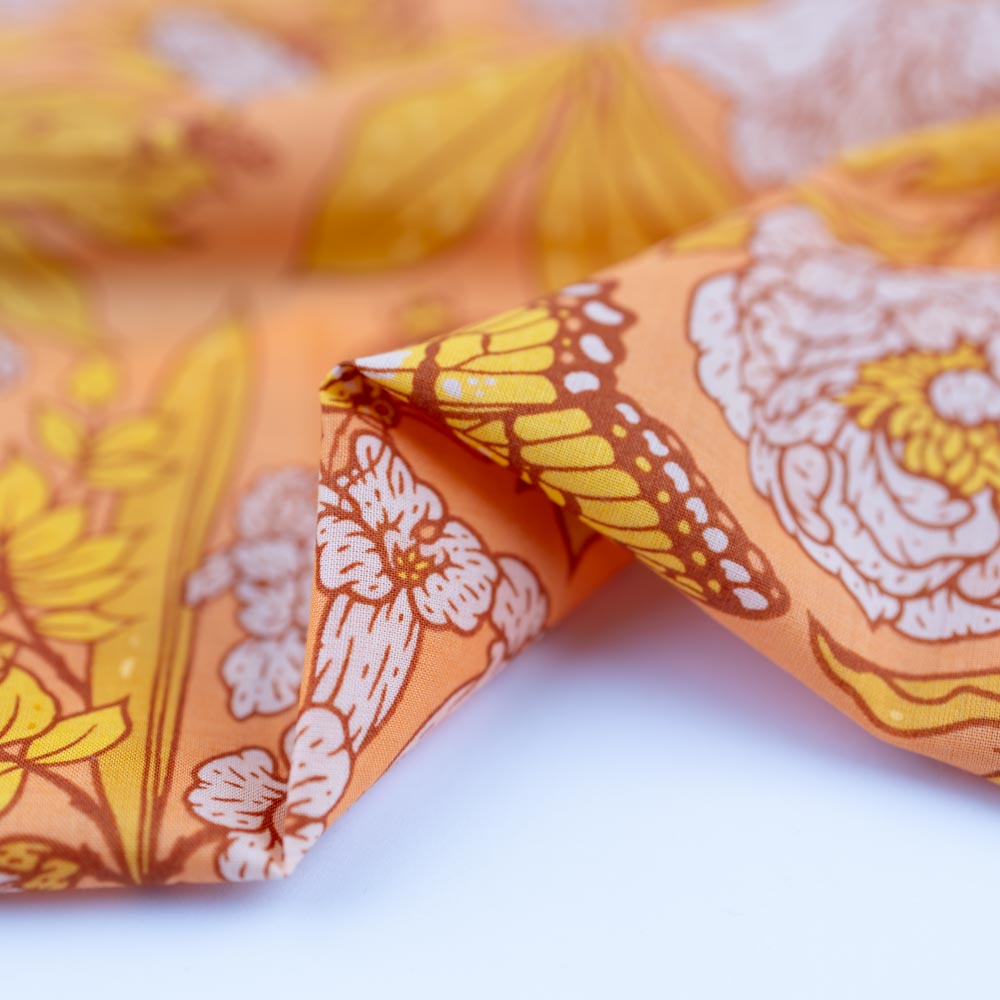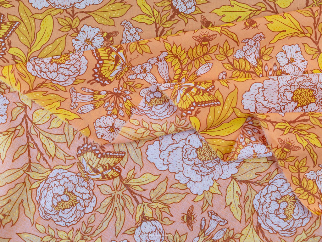This lightweight, organic cotton lawn fabric, designed by Elizabeth Jean Younce of Mustard Beetle, is part of Birch Fabric's Bountiful collection. It's a bright melon orange with peach peonies and vivid mustard and gold leaves, bees, and butterflies. Slightly translucent (but made less so by the print), this smooth fabric is perfect for billowy blouses and dresses, as well as fluttery curtains and home accessories.