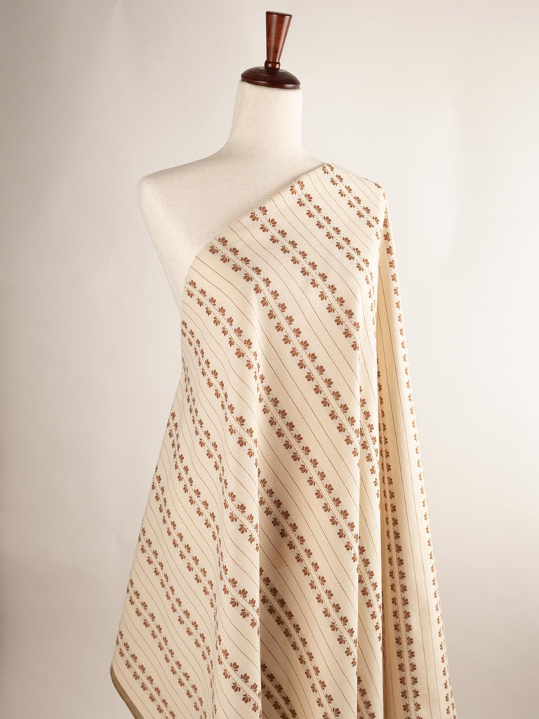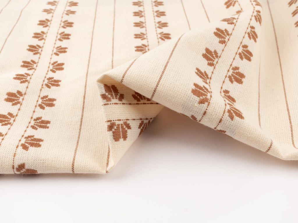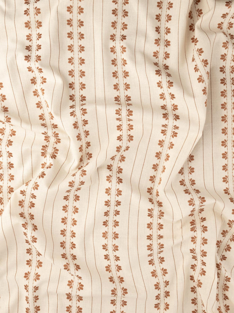 Deco Stripe in Umber is a 100% cotton fabric from Fableism's Golden Hour collection. Woven with yarn-dyed stripes in soft, earthy brown tones, it captures the feel of late-afternoon light and long, golden shadows. With a light-medium weight (150 GSM) and 44" width, it's lovely for garments like shirts, dresses, and easygoing pants. It also shines in quilts, cushions, and other home projects.