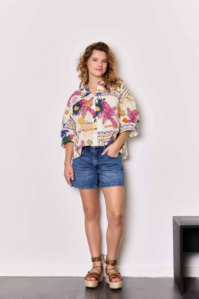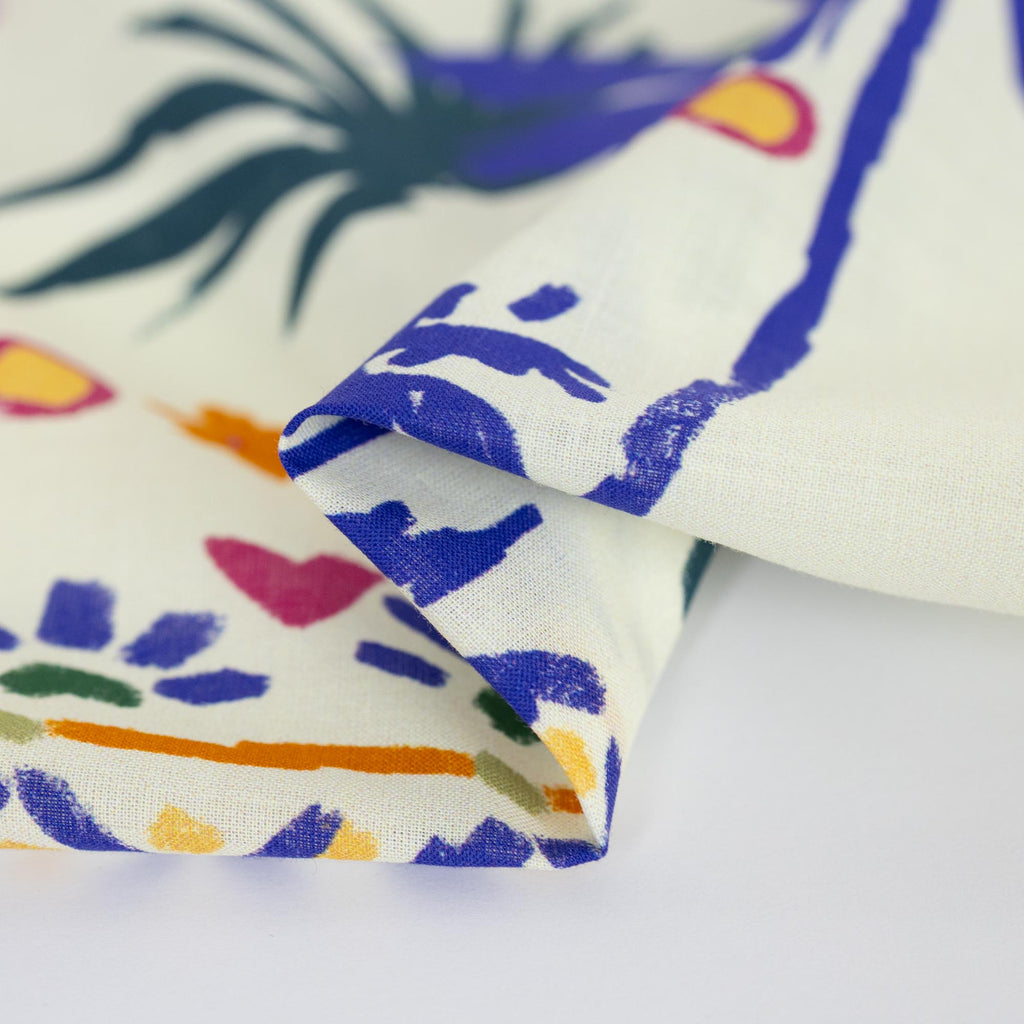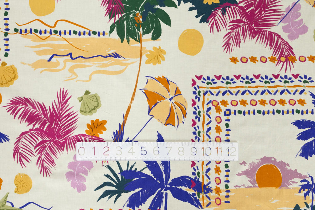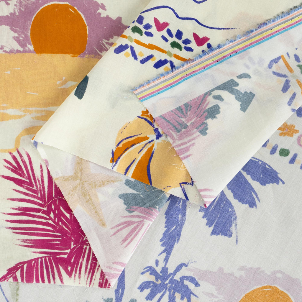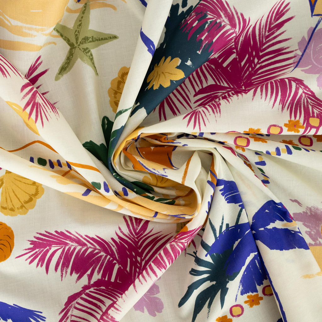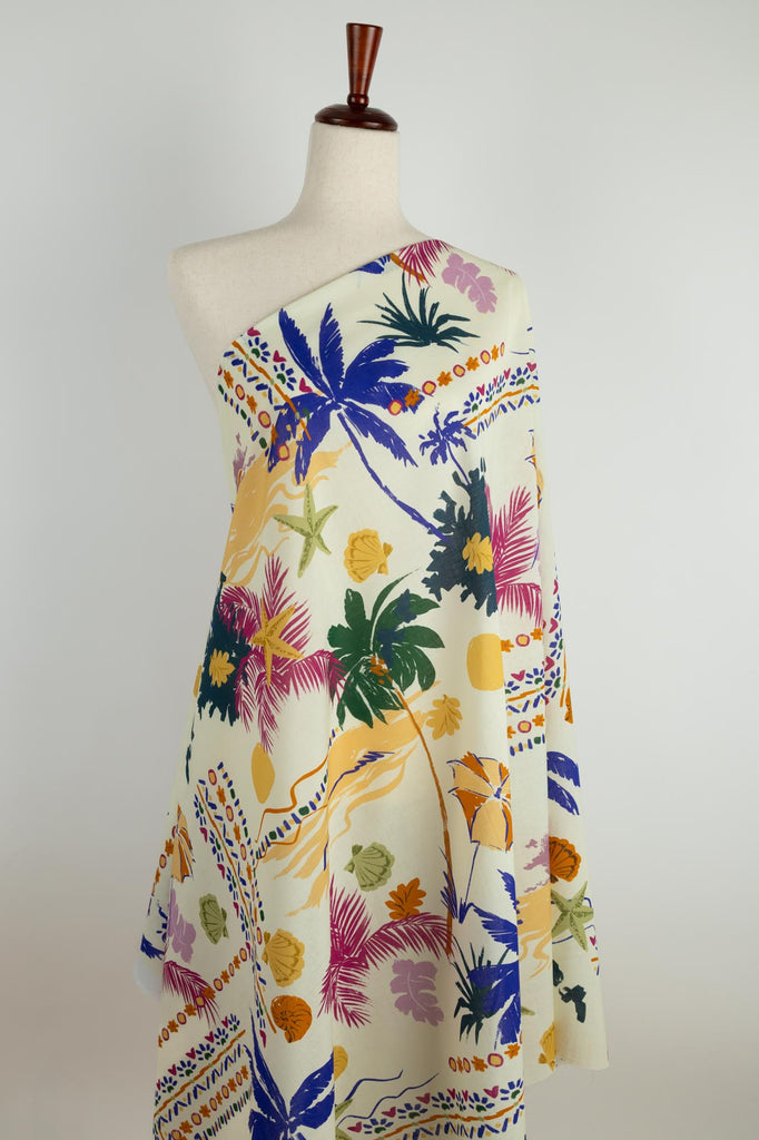 Hawaiian Dream is a lightweight cotton lawn fabric in cream with idyllic beach scenes in jewel tones. Designed by Atelier Jupe of Belgium and printed in Italy, this finely woven fabric is Oeko-Tex certified non-toxic. Perfect for clothing, such as blouses, skirts, dresses, scarves, and more.