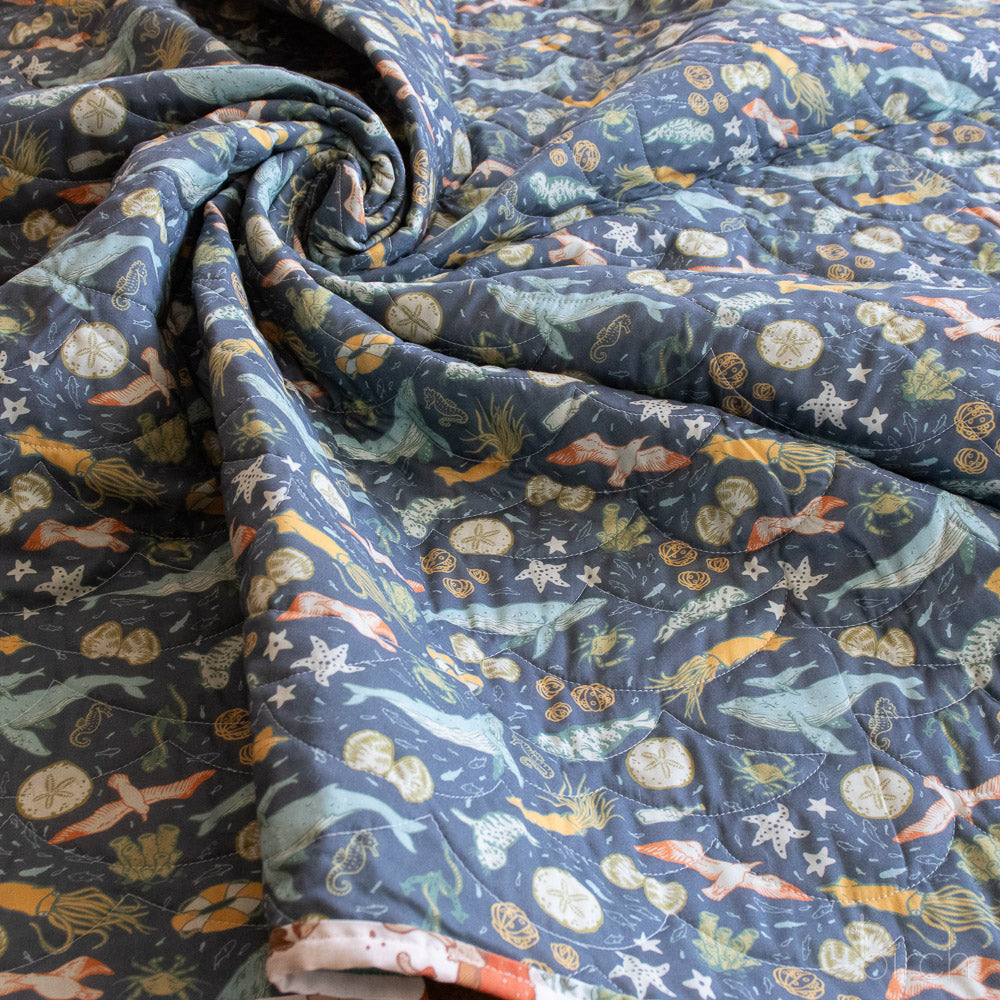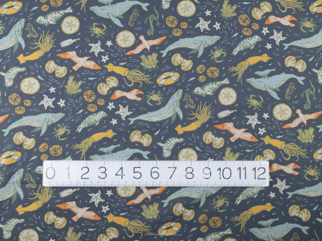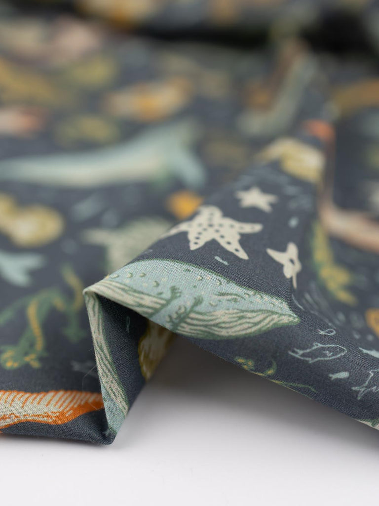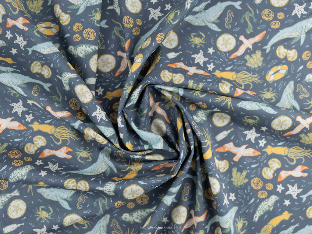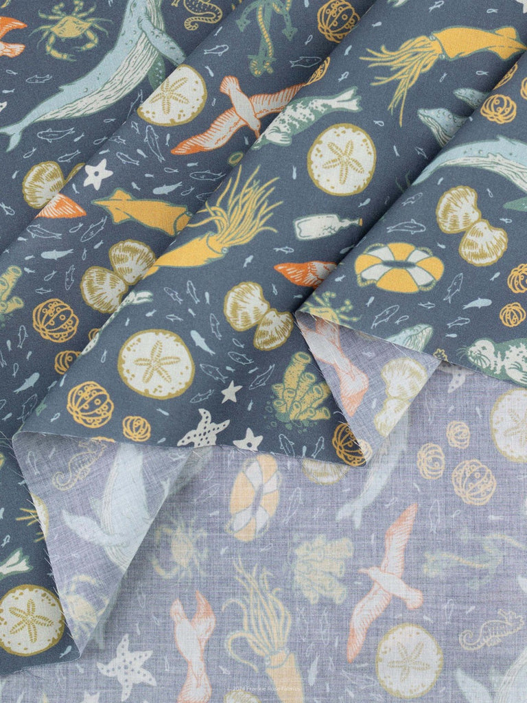 This lightweight, organic cotton lawn, designed by Elizabeth Jean Younce of Mustard Beetle, is part of Birch Fabric's sought-after Wild Coast Collection. It sports the marine creatures of the cold Pacific waters on a blue-gray sea. Slightly translucent (but made less so by the print), this smooth fabric is perfect for billowy blouses and dresses.