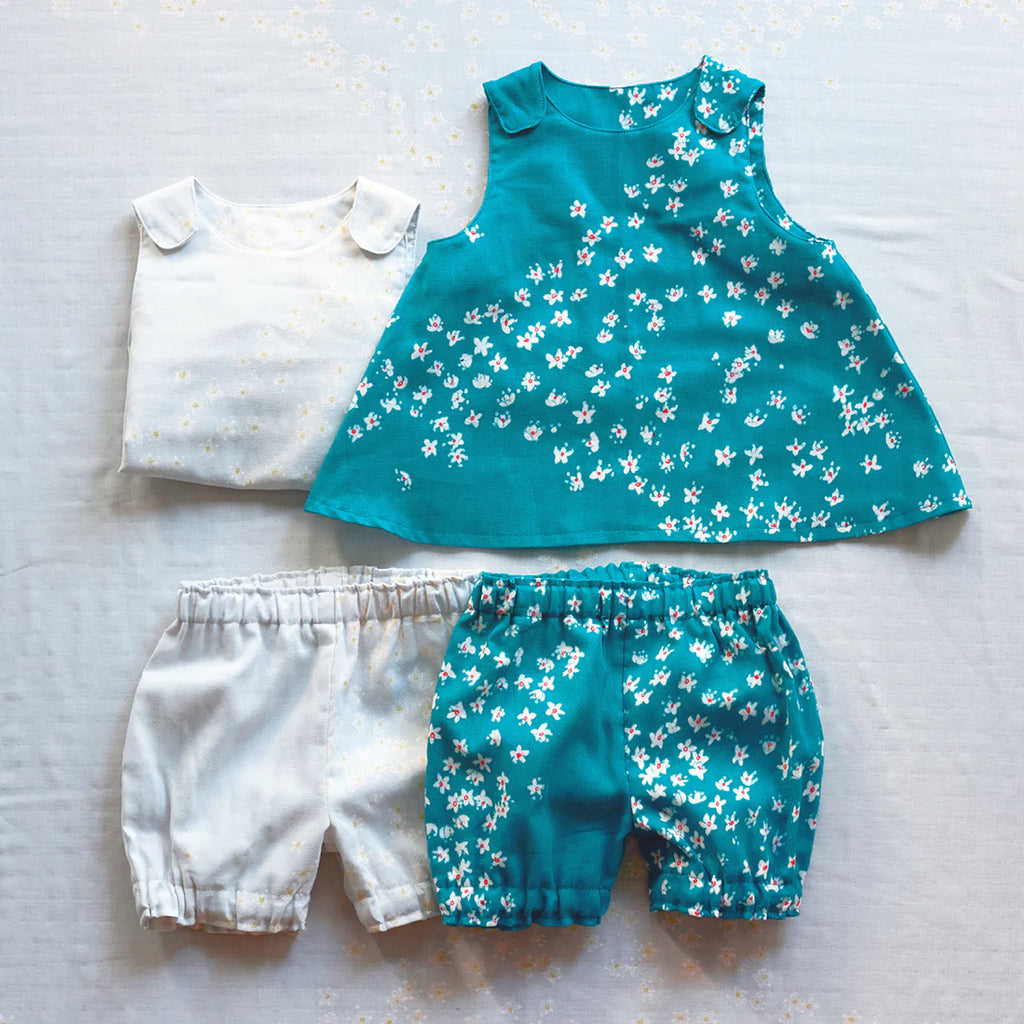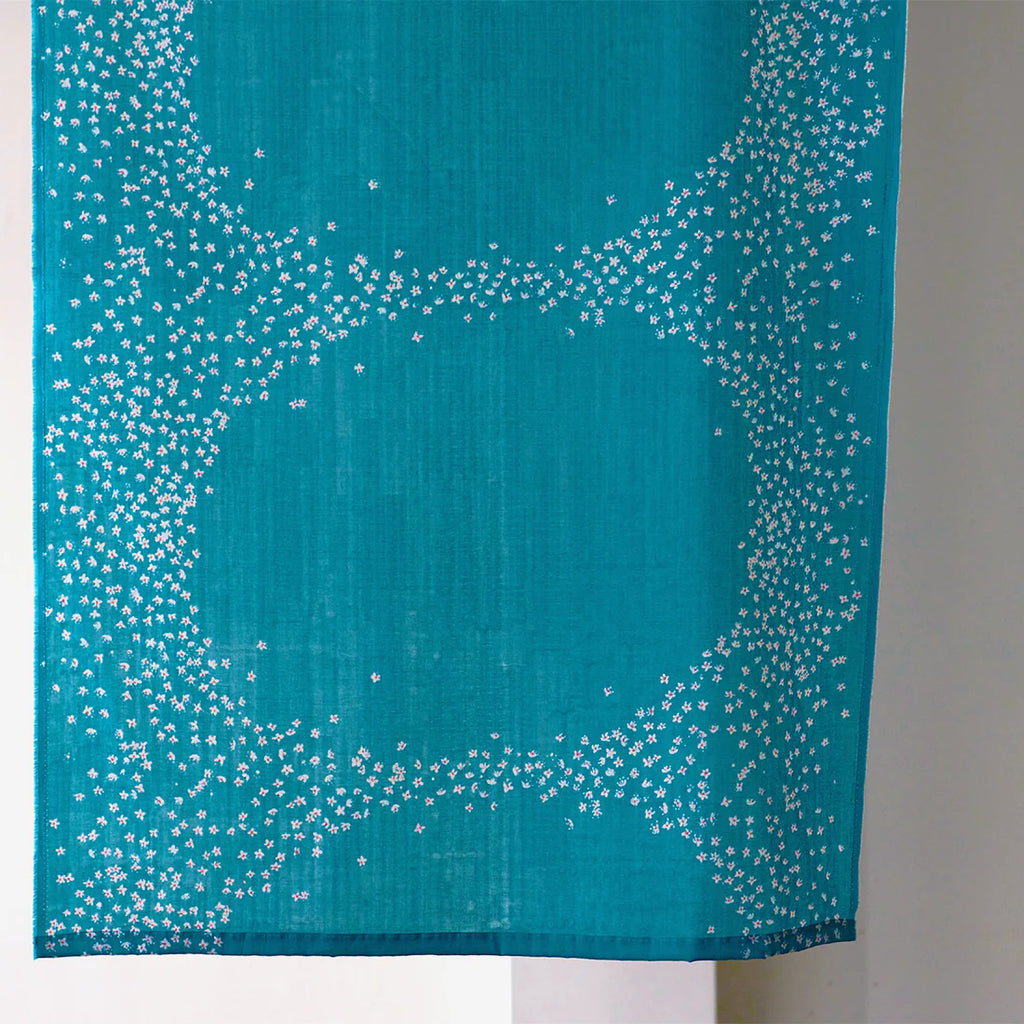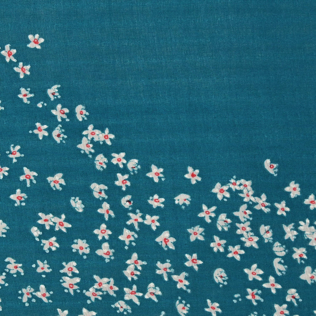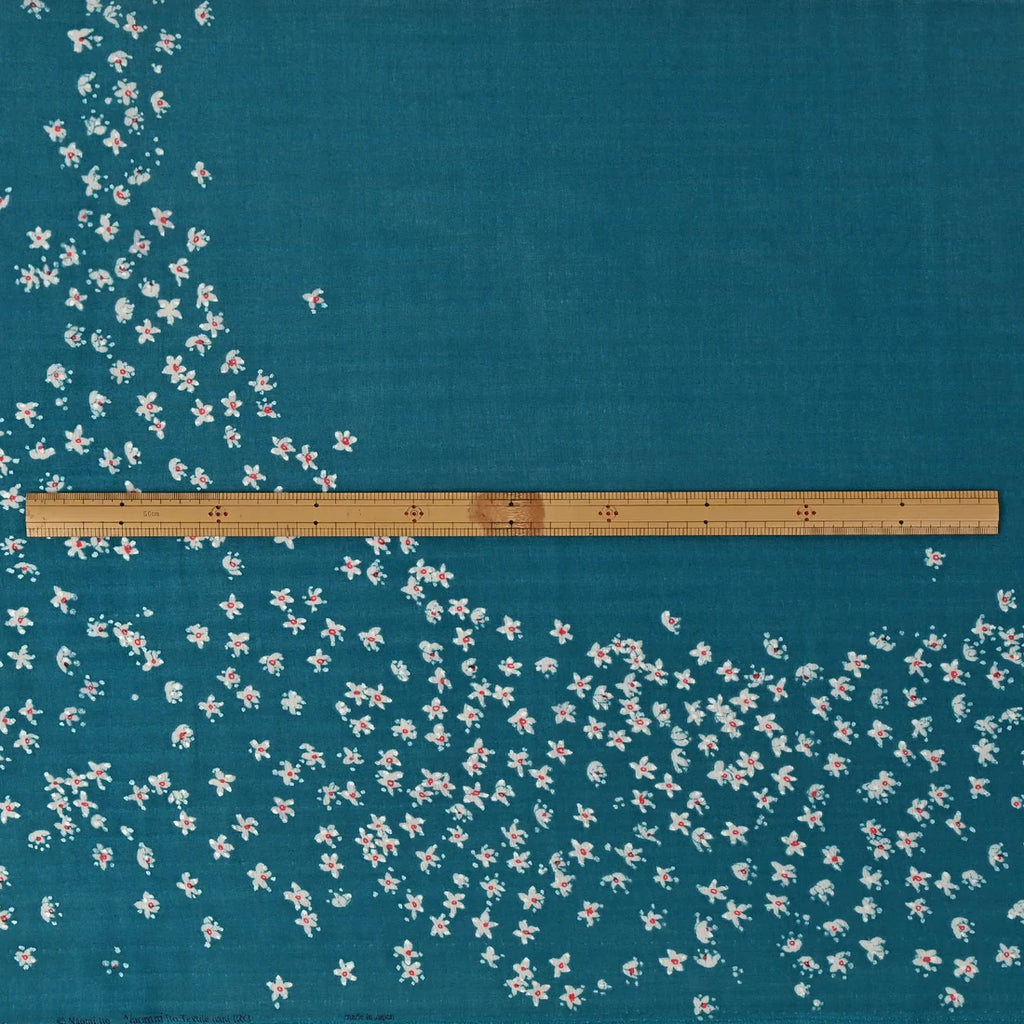 Vibrant teal organic cotton double gauze fabric from beloved Japanese designer Nani Iro. Beautifully unique, with small white flowers with dots of red on a deep cobalt blue, in a large-scale pattern of open circles. Lightweight and opaque, perfect for summer garments and accessories.