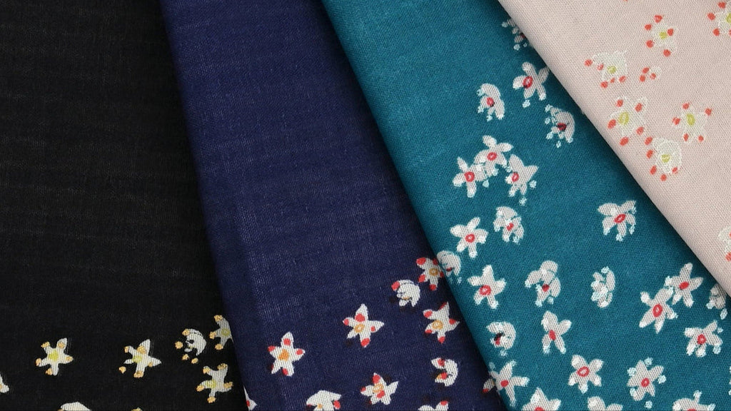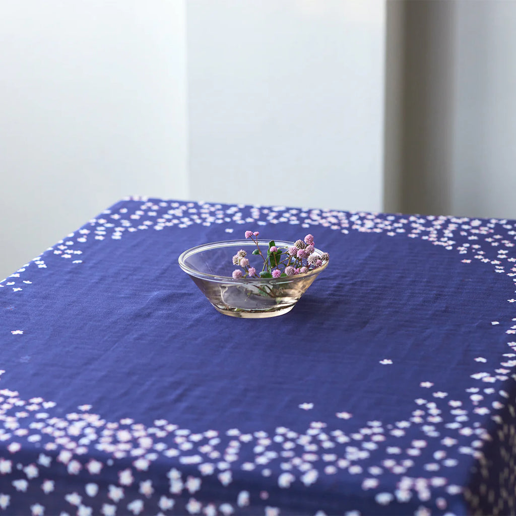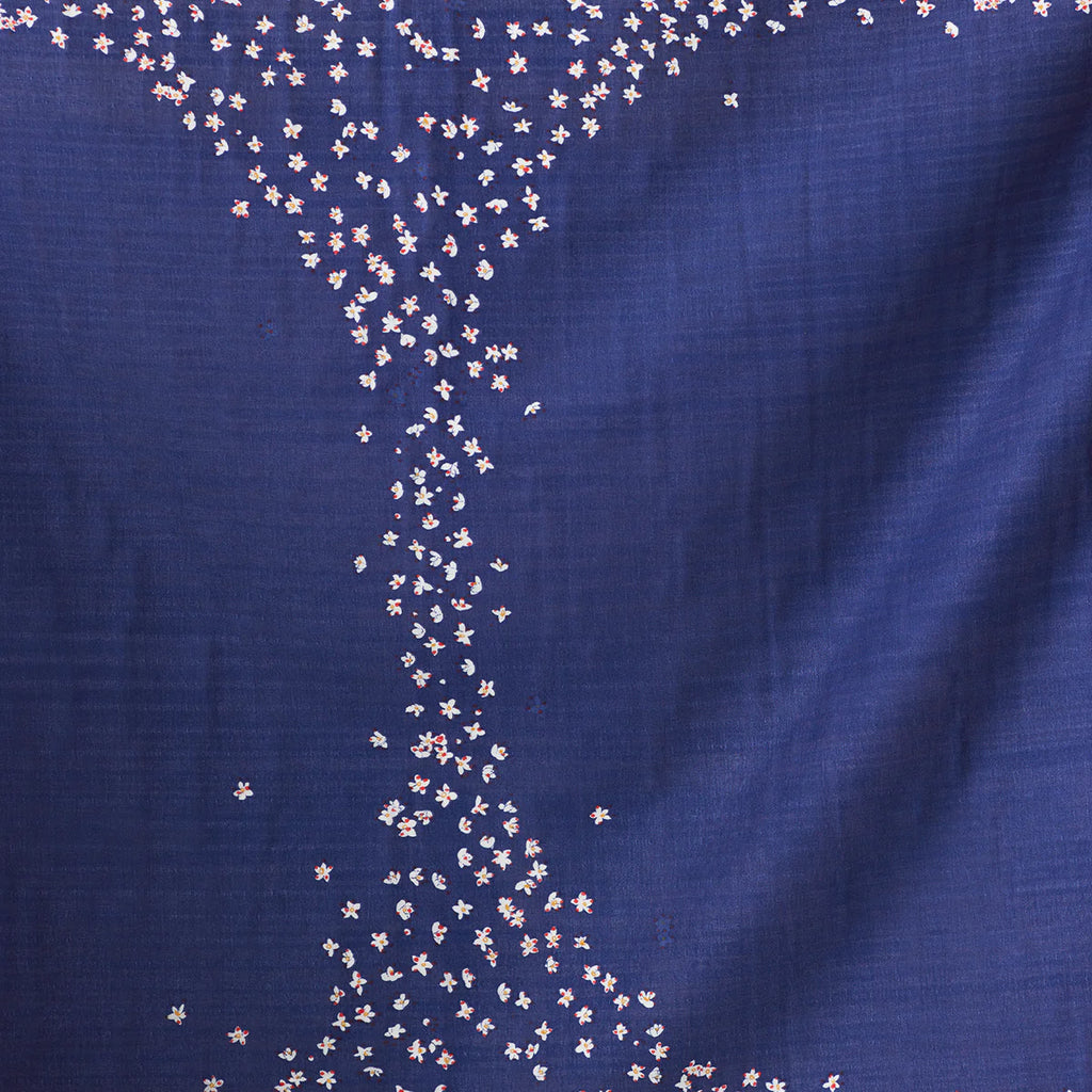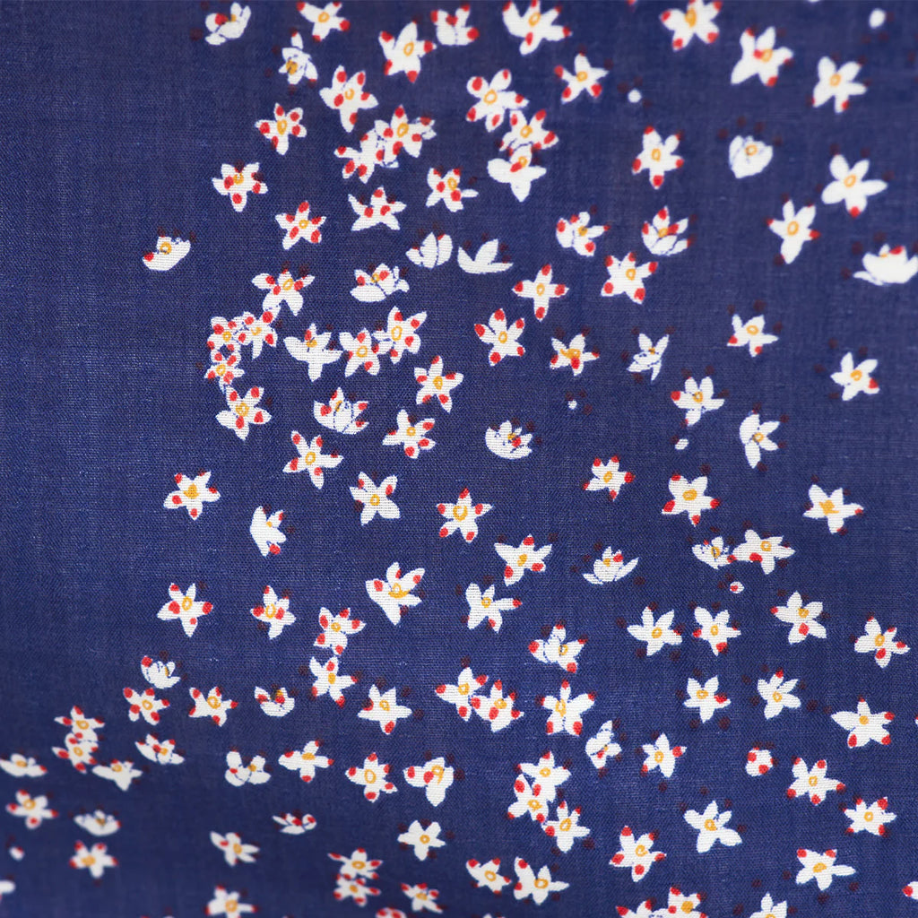 Rich blue organic cotton double gauze fabric from beloved Japanese designer Nani Iro. Beautifully unique, with small white flowers with dots of red on a deep cobalt blue, in a large-scale pattern of open circles. Lightweight and opaque, perfect for summer garments and accessories.