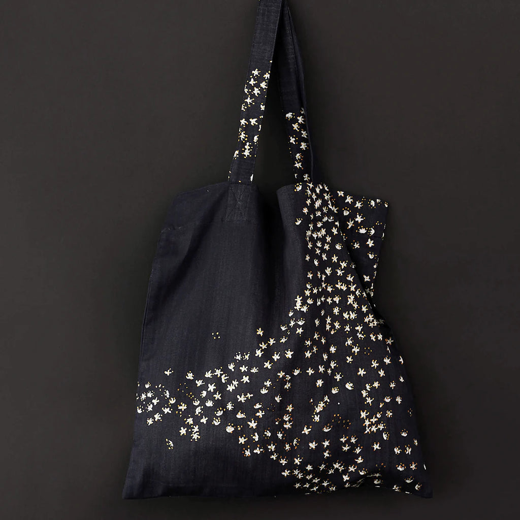 Rich black organic cotton double gauze fabric from beloved Japanese designer Nani Iro. Beautifully unique, with small white flowers with dots of red on a deep cobalt blue, in a large-scale pattern of open circles. Lightweight and opaque, perfect for summer garments and accessories.