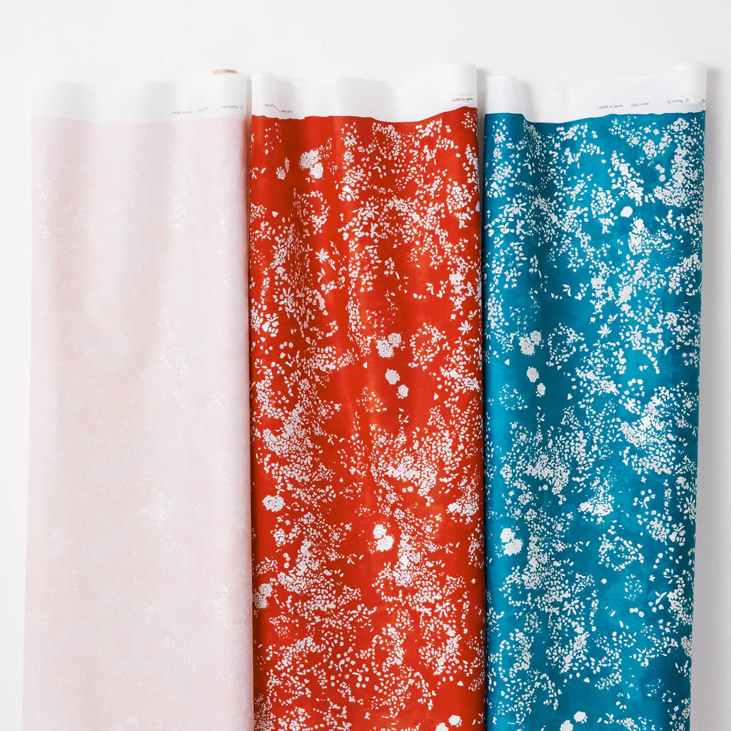Crisp, smooth organic cotton lawn fabric from beloved Japanese designer Nani Iro. Small white flowers on a pale pink watercolor background, made extra special by touches of metallic silver. An opaque, lightweight fabric with body, perfect for blousy summer garments.