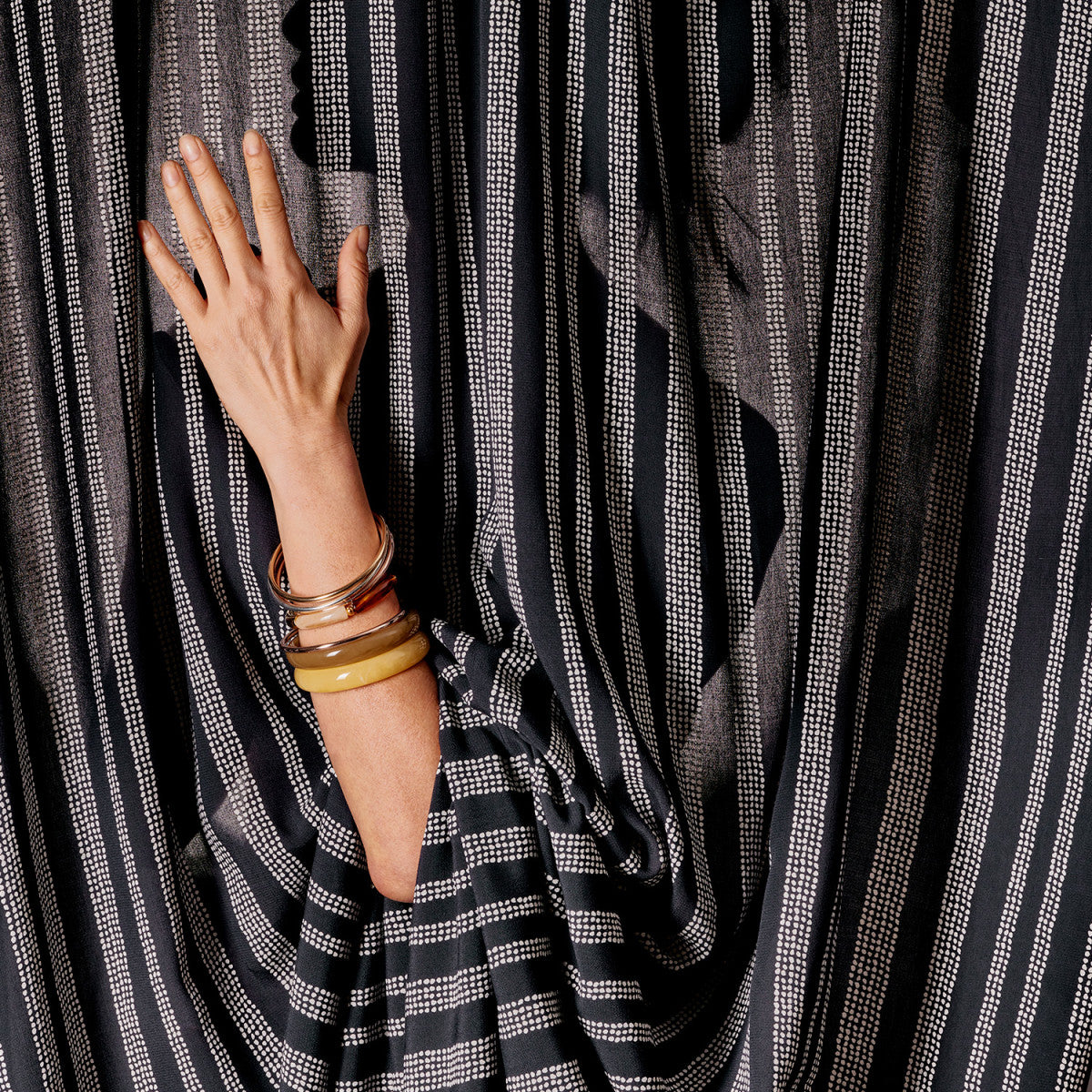 Gaia Deep Charcoal Viscose Crepe by Atelier Brunette is a premium quality, super silky, fluid fabric in black with a dotted stripes ranging from 1/2 to 1 inch wide. Lightweight but opaque, playful and modern, this fabric would make great dresses, skirts, blouses, and more. Made from highly sustainable EcoVero fibers and designed in France.
