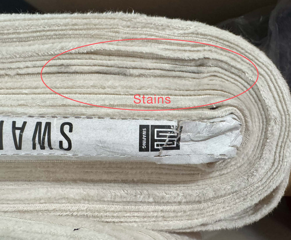 Note: This fabric is seconds and is 20% off retail. It got stained in transit along the folded edge of the bolt (see last photo). In our experiments, the stains have washed out easily. But since we can't guarantee they will, our loss is your gain!