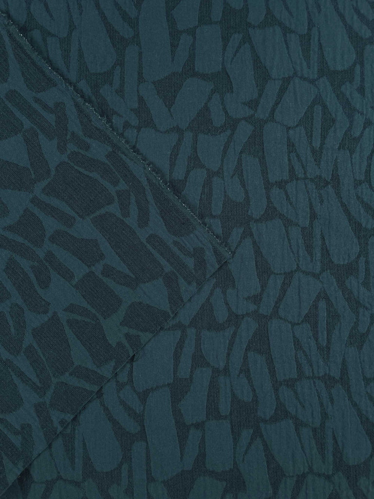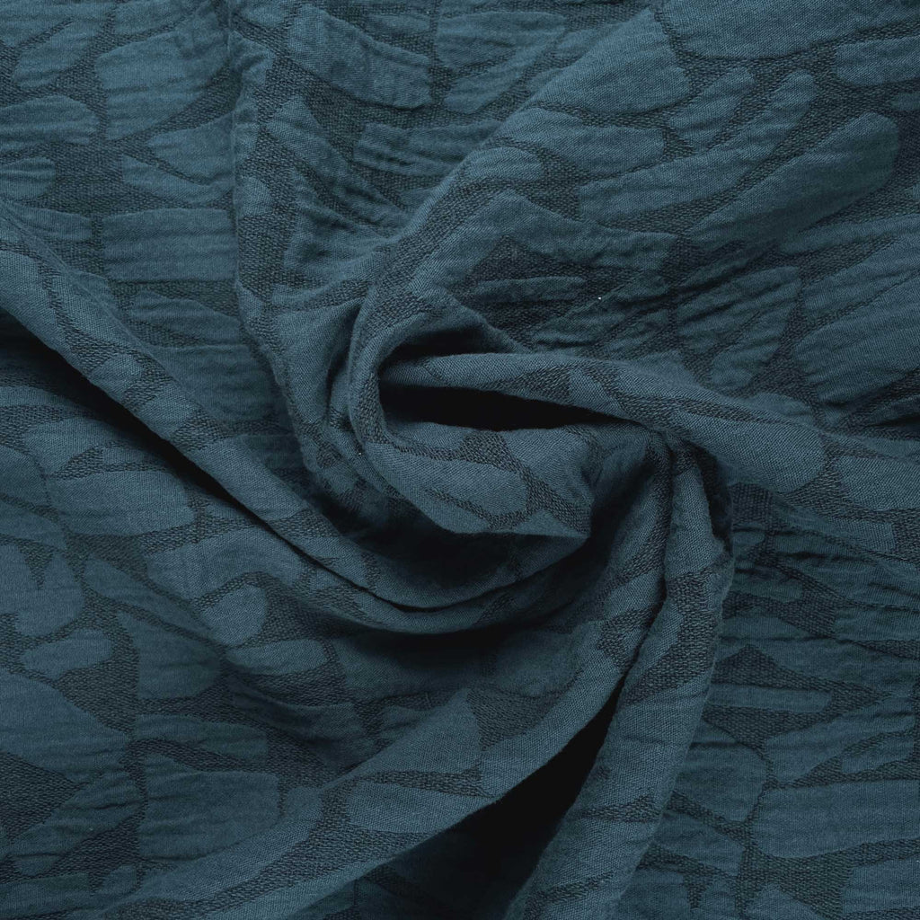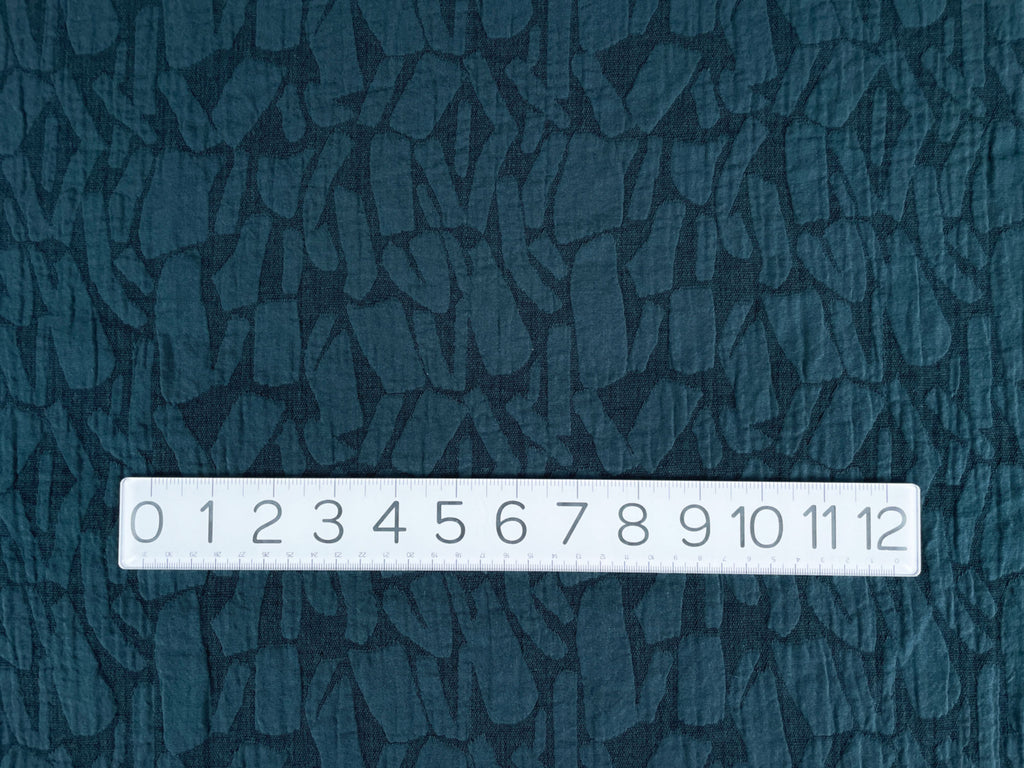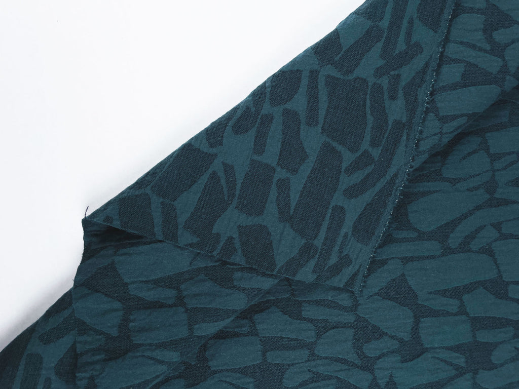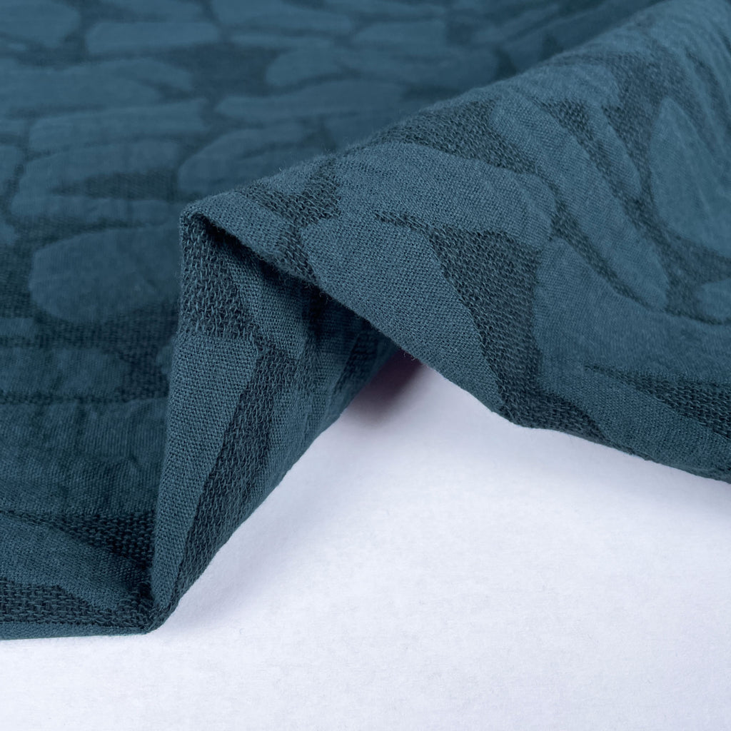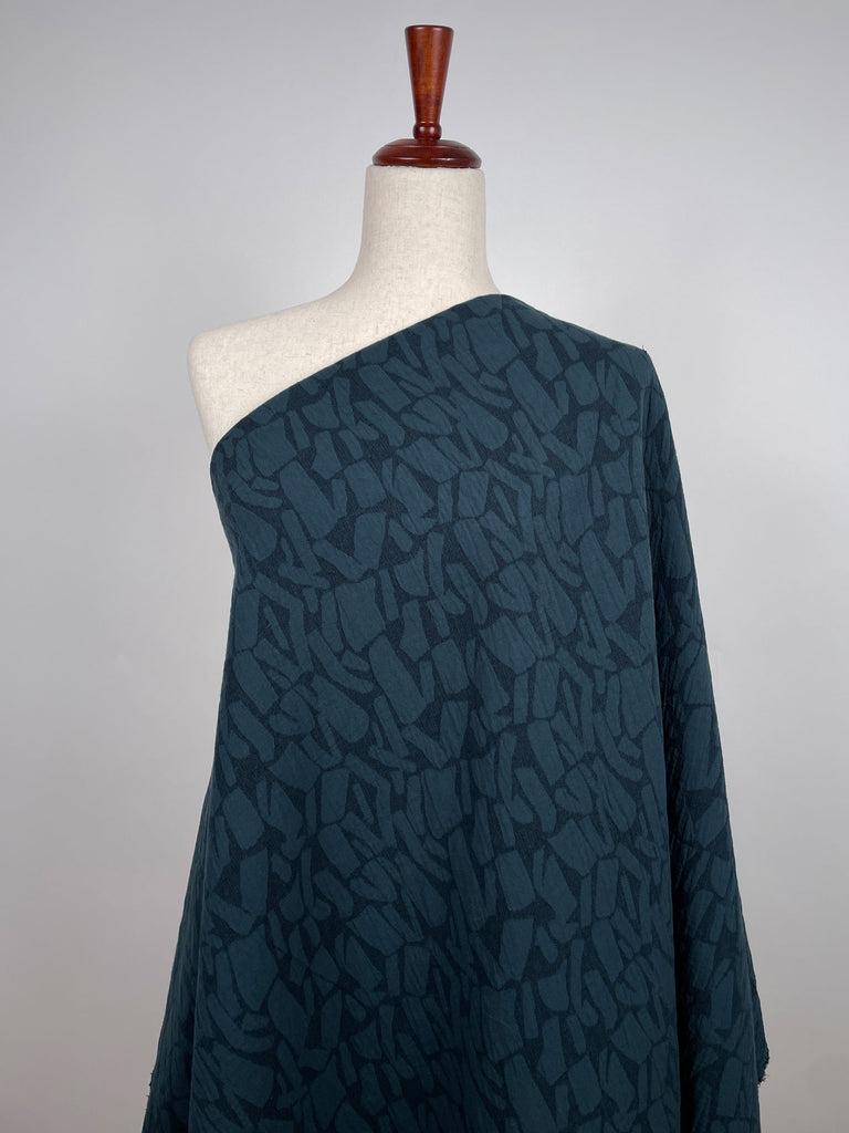 Stand out in our beautiful Weston Jacquard cotton linen blend fabric. A unique double-faced jacquard with a sophisticated pattern reminiscent of brush strokes that can be worn either side out. Its texture is reminiscent of a lofty double gauze, but with enough weight that it is comfortable all year long. Perfect for pants, dusters, boxy tops, and more. This is a staff favorite - we steal some off the bolt with every restock! Sapphire Lagoon is a dark blue-green.