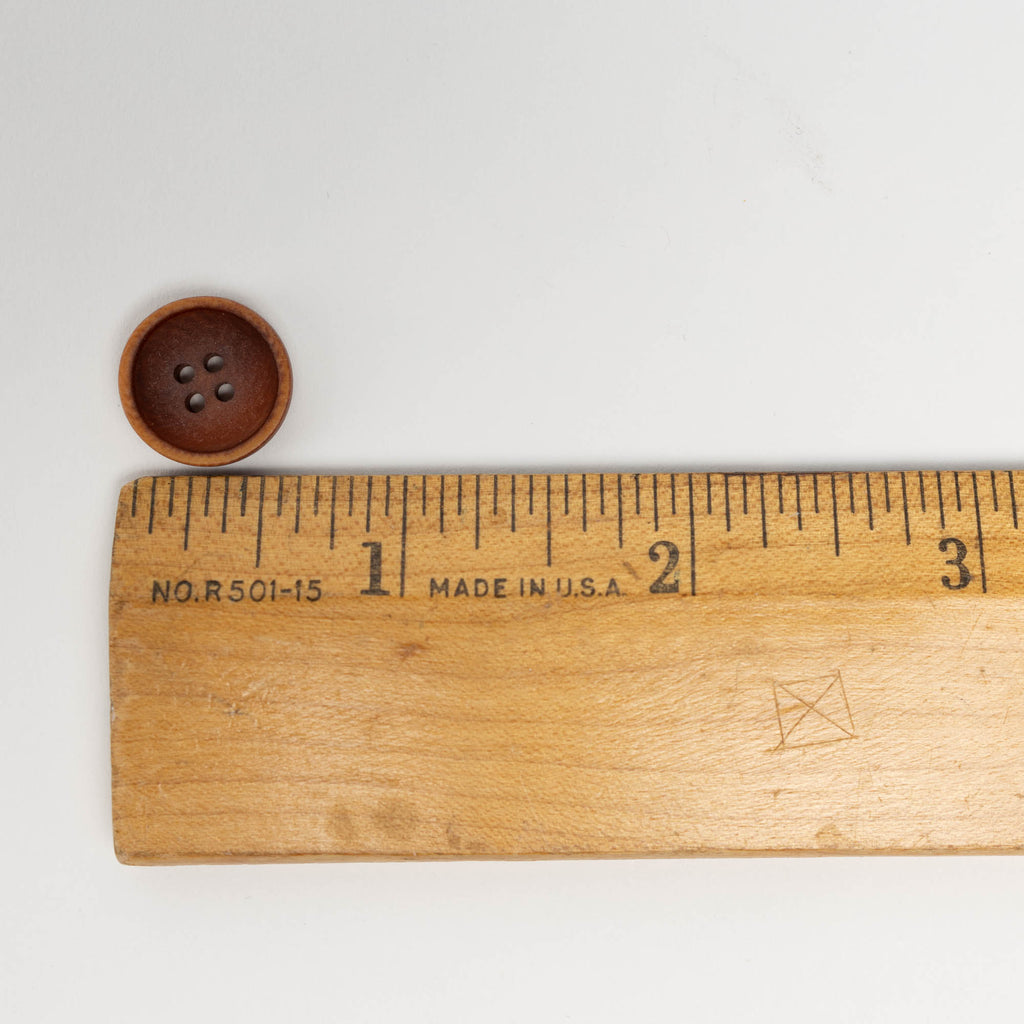 Durable, sustainable 15mm (5/8 inch) buttons in a matte, warm sienna. Corozo buttons are carved from the fallen nuts of the Tagua tree, a native of South America. They are tinted using natural dyes, which show off their beautiful natural grain and give them a natural look. They are resistant to scratches, impact, water, and heat, and are machine washable - a perfect eco-friendly choice for garments and accessories.