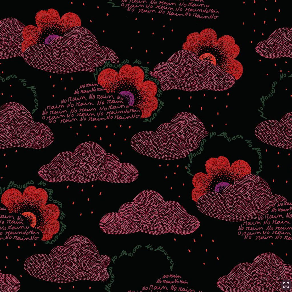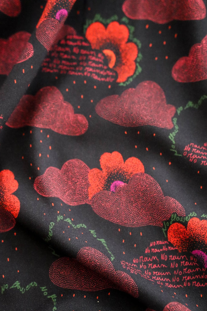 This unique print by Lise Tailor features clouds, flowers, and inspiration in vivid red on inky black. Lightweight, smooth, and swishy, this 100% viscose fabric is perfect for dresses, skirts, and blouses. Like a helpful reminder of our ability to endure, the text reads, "no rain, no flowers". Made from sustainably produced Ecovero fibers and Oeko-Tex certified non-toxic.