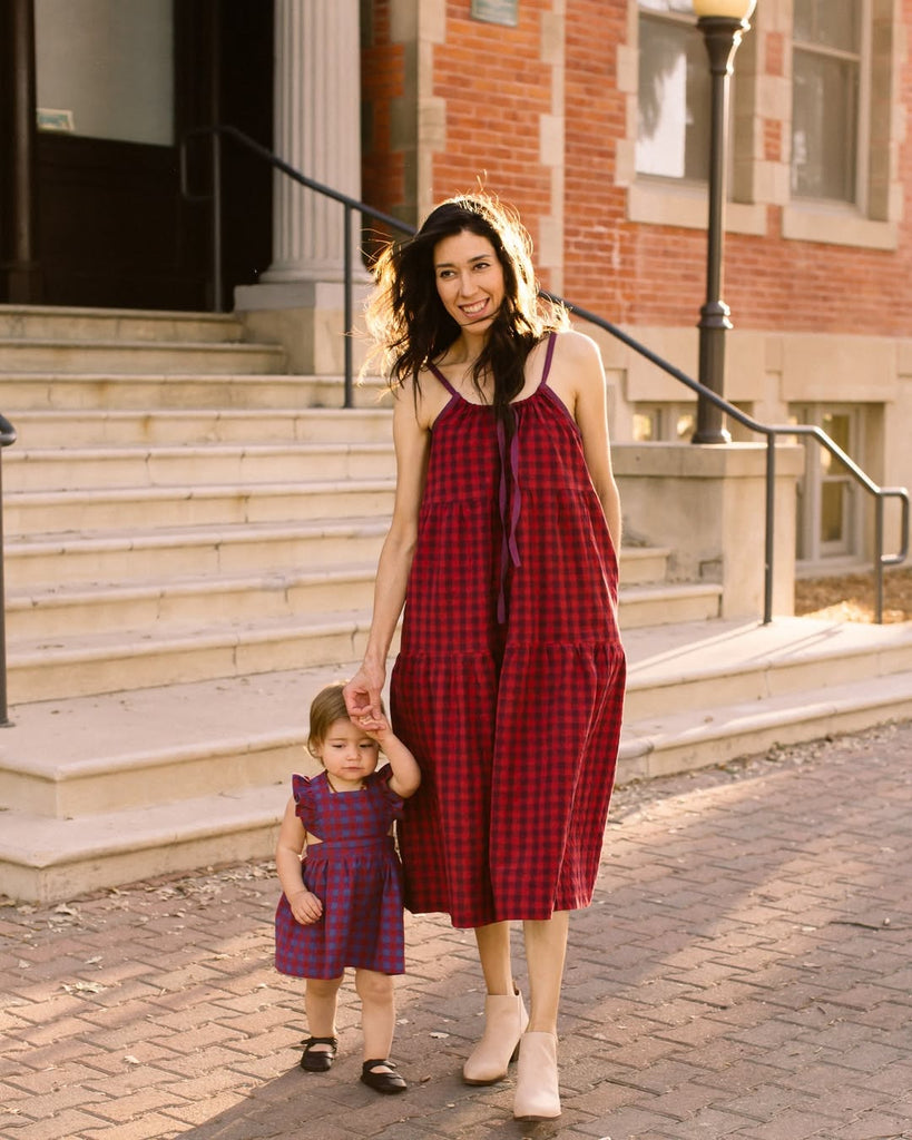 A pretty and whimsical cotton gingham from Fableism, Queen of Hearts in Maraschino is a mix of vibrant cranberry red and dark purple, with a subtle heart inside each .5" x .5" check. This fabric was designed with clothes in mind, at 55" wide and a drapey, lightweight 130 gsm.