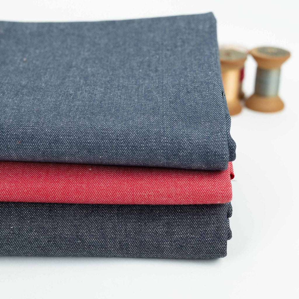 A beautiful denim fabric from Japan by Sevenberry. This yarn-dyed, 100% cotton fabric has the typical undyed weft threads of denim with cherry red warp threads in a twill weave, giving it depth and character. It is soft and on the lighter end for denim, making it great for all-season apparel and accessories. Coordinates perfectly with the Hickory Stripe Denim in Red.