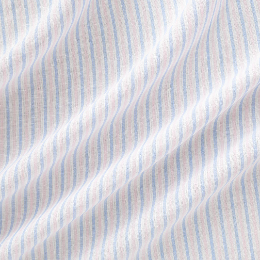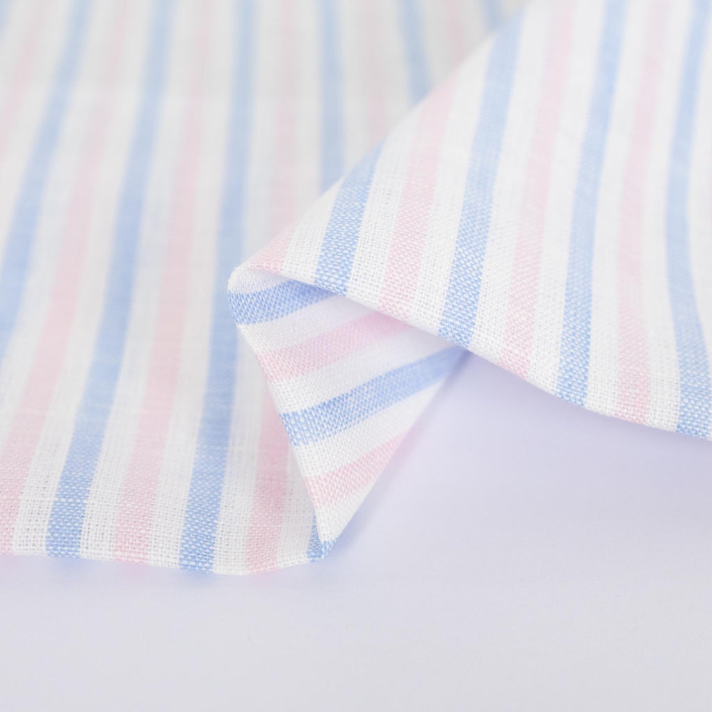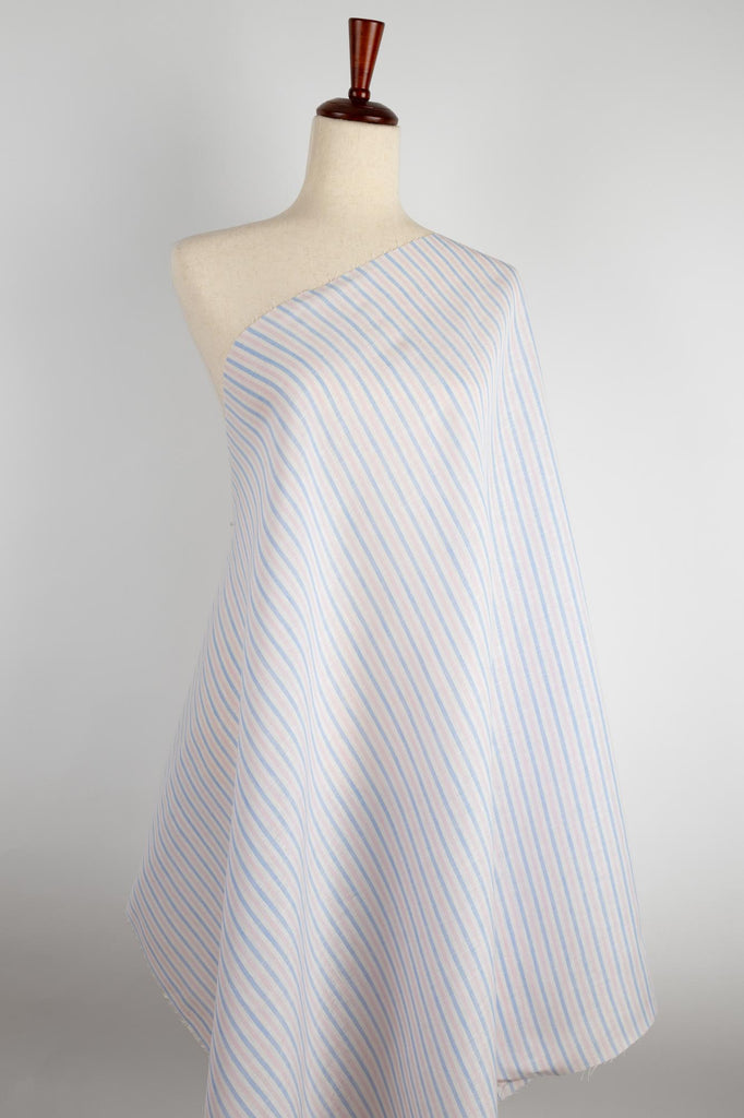 Lightweight but not sheer, it's ideal for easy summer tailoring: think relaxed button-ups, crisp shorts, wide-leg capris, or a warm-weather blazer. The shade "Bluebell" has yarn-dyed stripes in sky blue, black, and white.