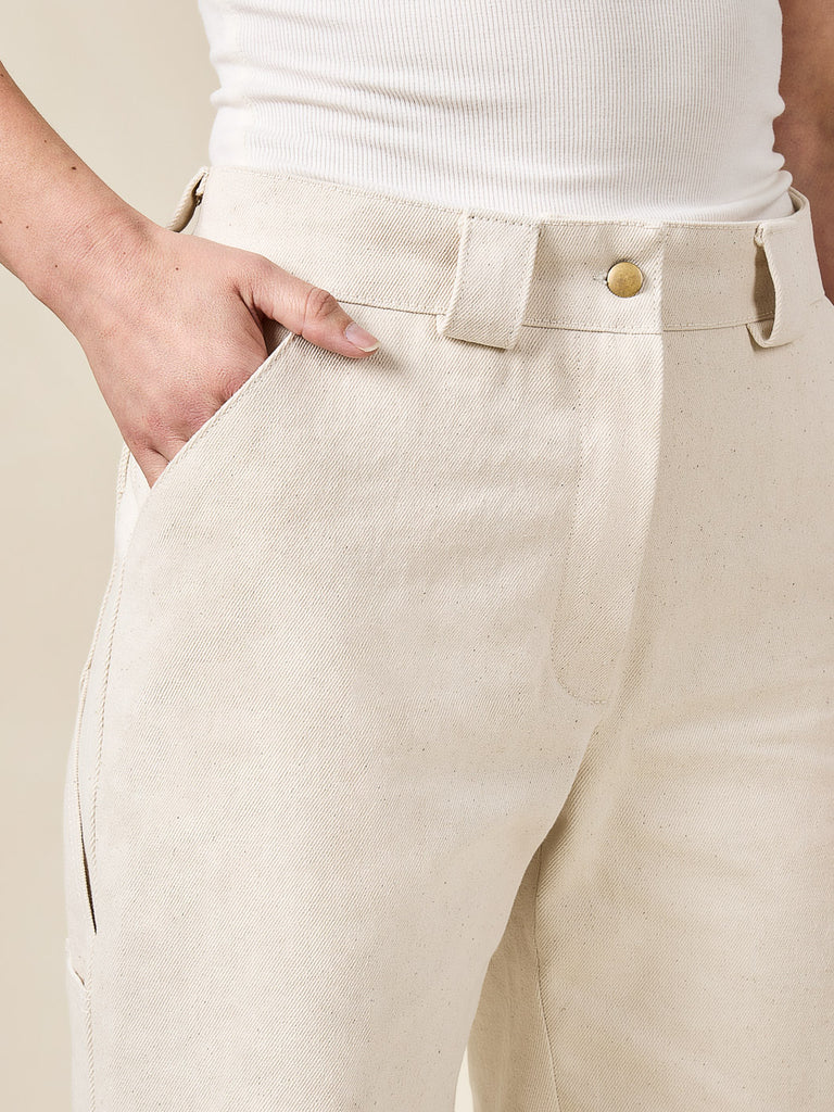 - View B is full-length and utilitarian with a classic waistband, wide belt loops, and carpenter-style pockets in the back.