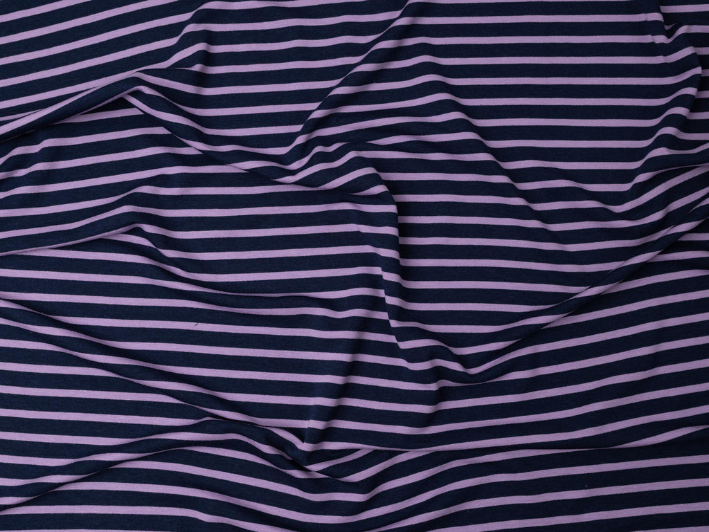 This playful twist on classic Breton stripes, in lavender and navy, will have you feeling comfortable in no time! Made from a soft and supple bamboo cotton blend with 5% elastane, this stretchy French terry fabric makes up into the coziest clothes. Perfect for shirts, soft pants, hoodies, pajamas, and more. Oeko-tex certified nontoxic for added peace of mind.