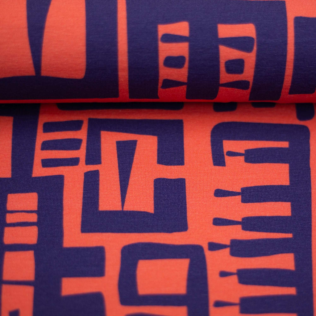 Funky is a bold, limited-edition cotton stretch jersey fabric from playful Austrian designer Bienvenido Colorido. Funky features bold abstract shapes in purple on a coral pink background. Swafing produces some of the world's highest quality jersey knits, and this is no exception. Great for soft clothes of all kinds - tops, dresses, skirts, and more.