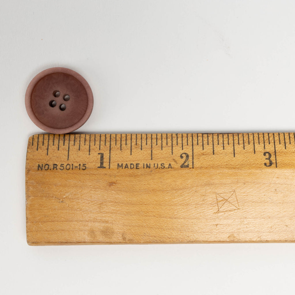 Durable, sustainable 20mm (3/4") buttons in a matte muted mauve. Corozo buttons are carved from the fallen nuts of the Tagua tree, a native of South America. They are tinted using natural dyes, which show off their beautiful natural grain and give them a natural look. They are resistant to scratches, impact, water, and heat, and are machine washable - a perfect eco-friendly choice for garments and accessories.