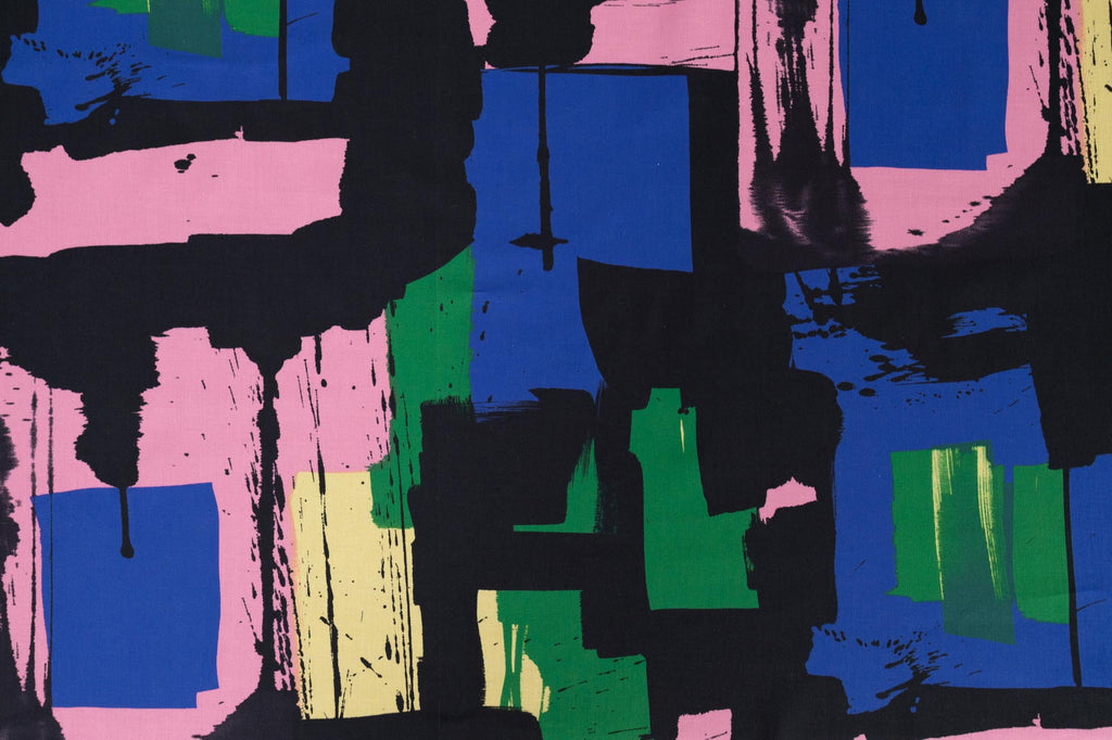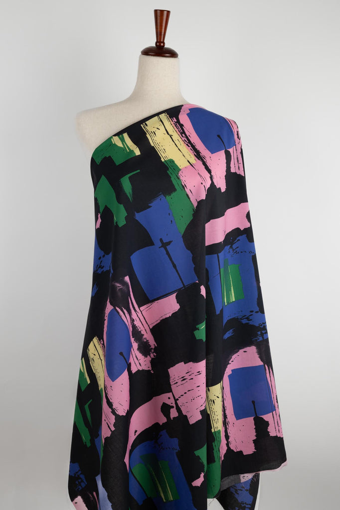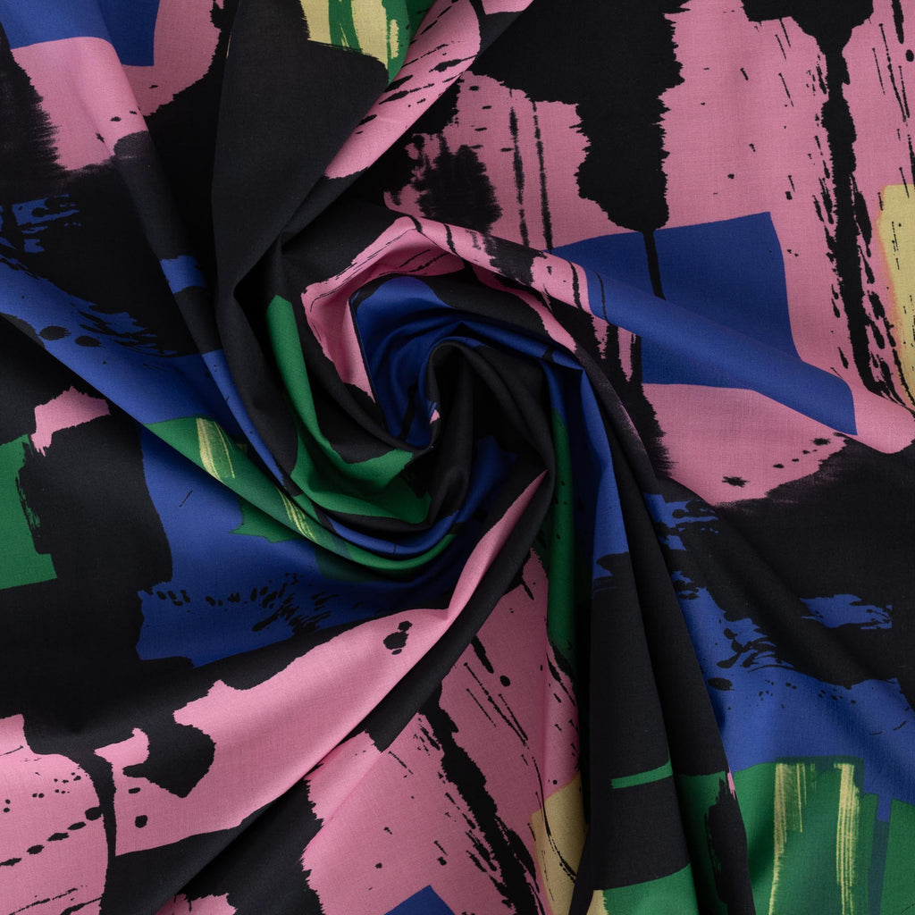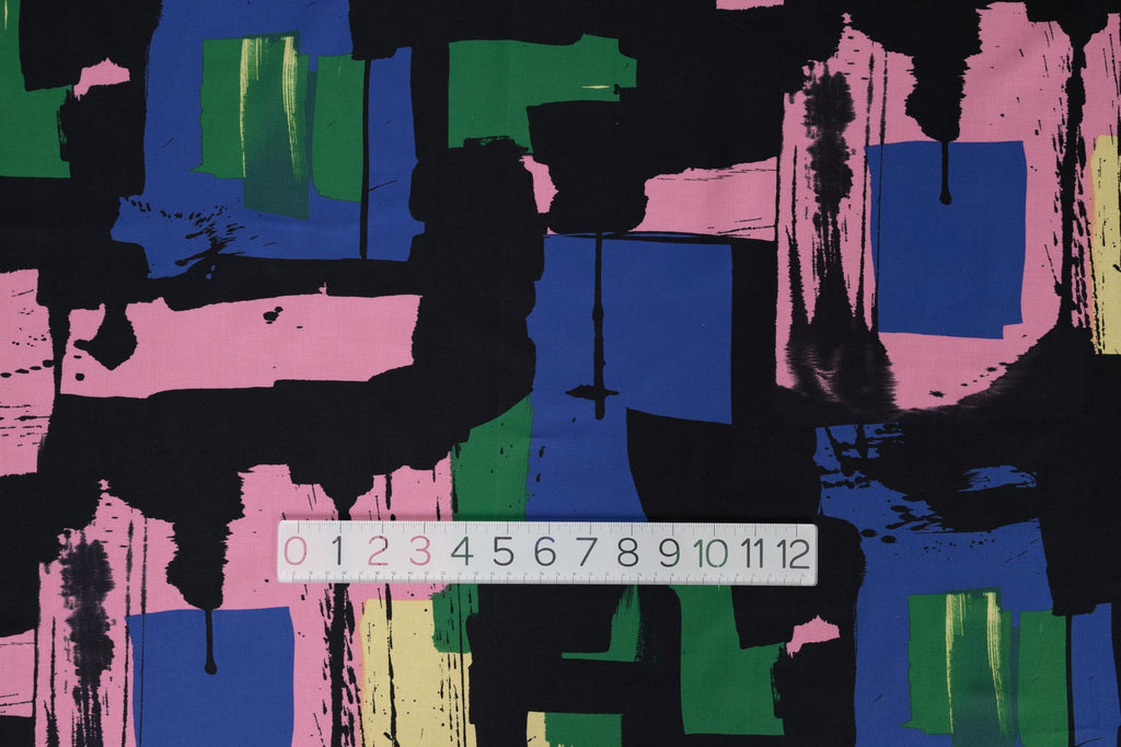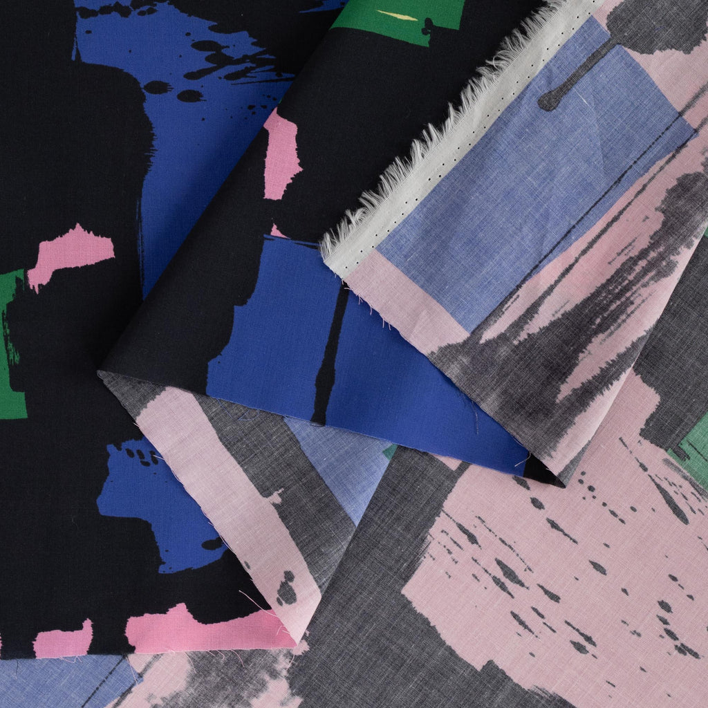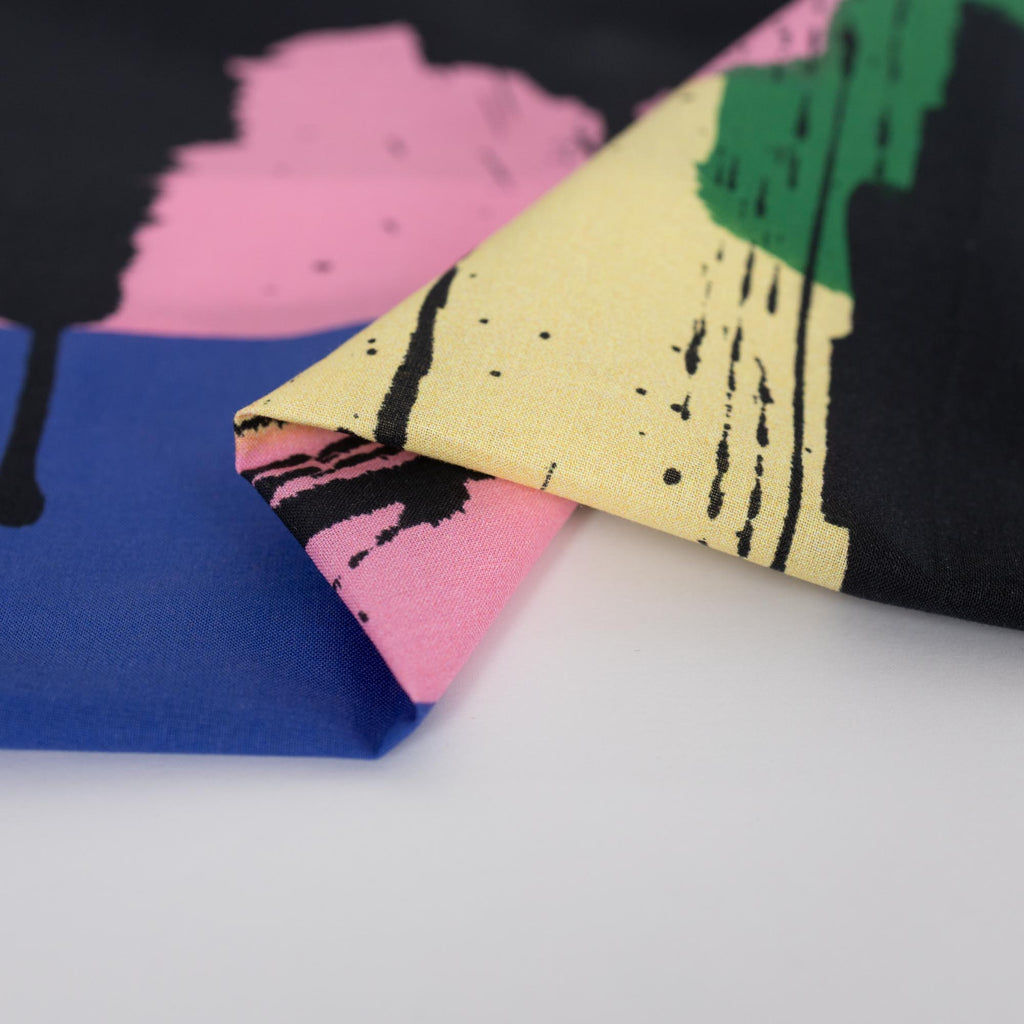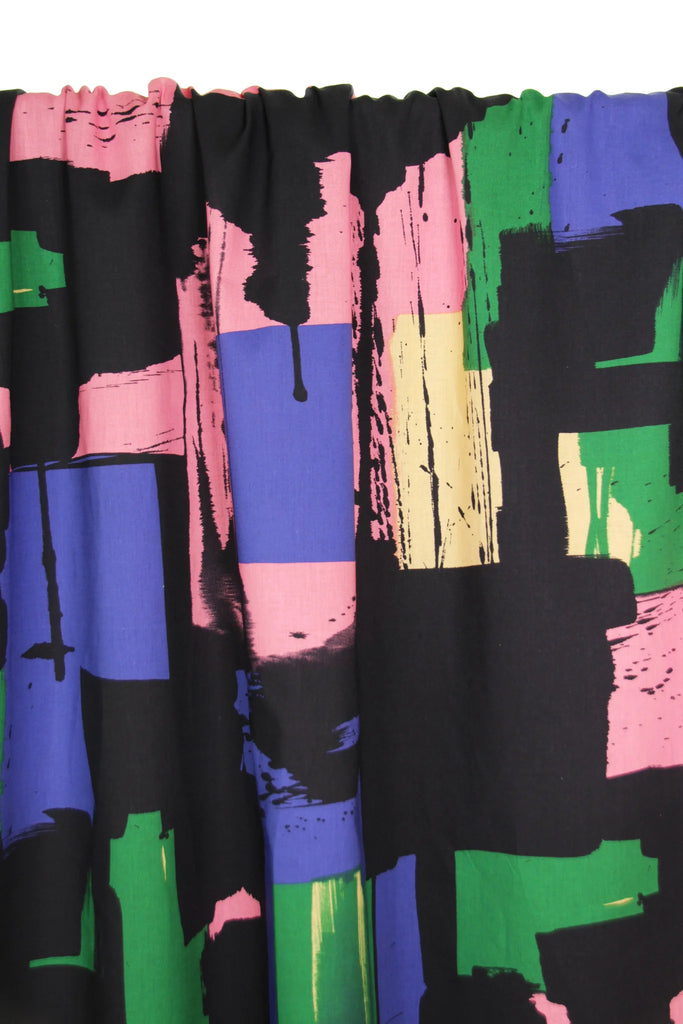 Fresh Paint is a lightweight cotton lawn fabric with painted blocks of pink, blue, green, and yellow on a black background. Designed by Atelier Jupe of Belgium and printed in Italy, this finely woven fabric is Oeko-Tex certified as non-toxic. Perfect for clothing, such as blouses, skirts, dresses, scarves, and more.